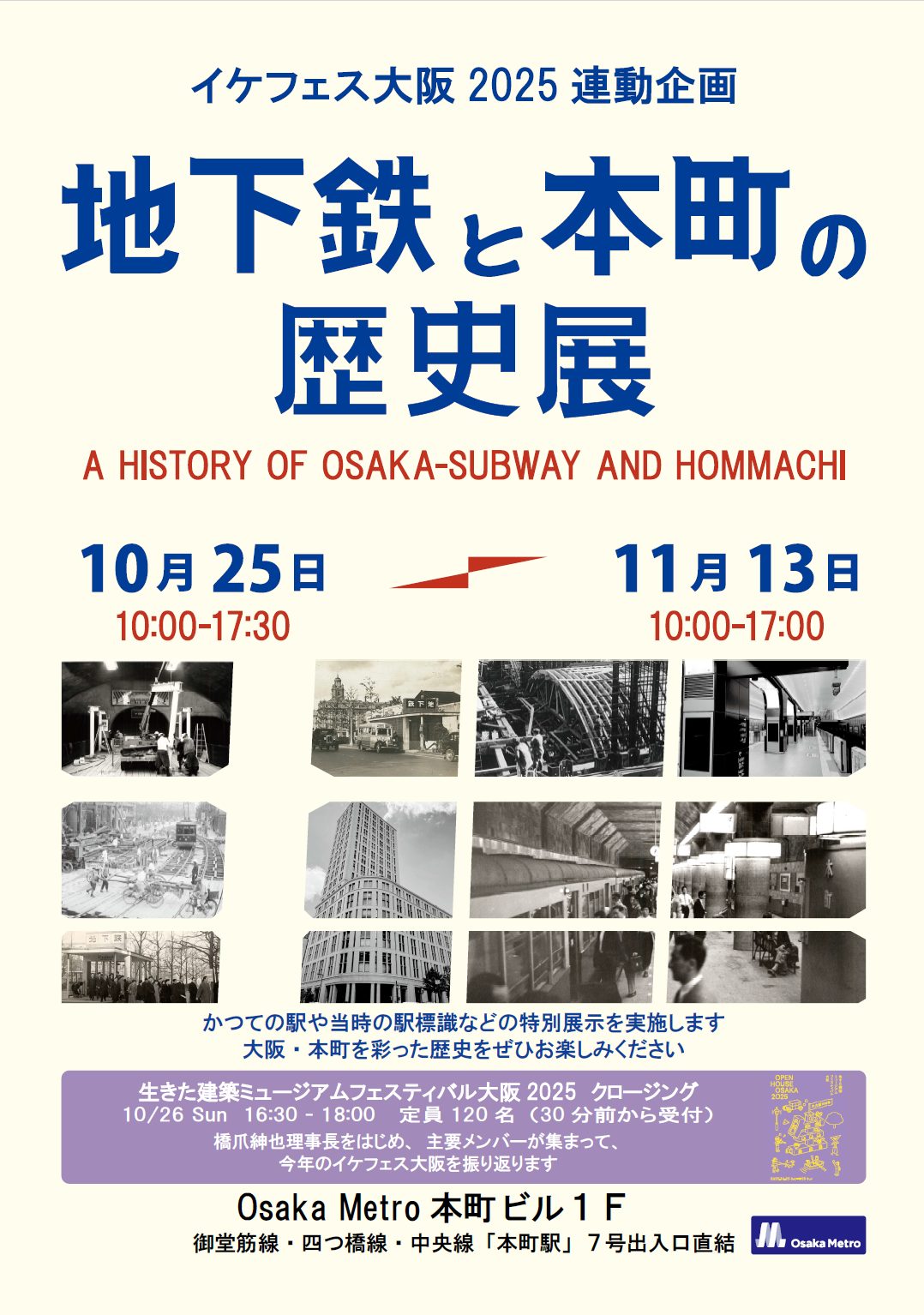 イケフェス大阪2025連動企画として、Osaka Metro 本町ビル1階のパブリックスペースで本町と地下鉄の歴史を紹介する特別展示を開催。 10月26日には、同会場でイケフェス恒例のクロージングトークも開催されます。